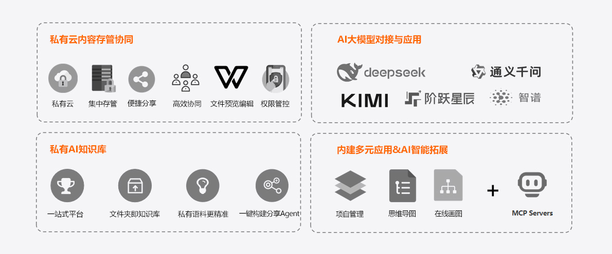 无需繁琐的AI知识库创建、数据导入和权限配置,您私有云办公中的所有文件都是知识库,最⼤程度符合操作直觉。