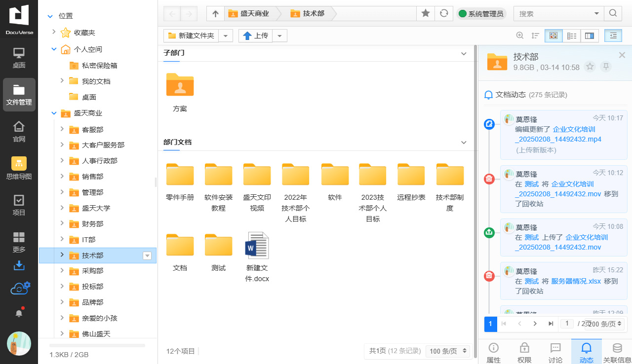 企业数据的集中存管是DocuVerse云办公的核心功能,让用户在简单易用的操作界面,轻松完成日常办公,如文件的上传、下载、共享等功能,同时又有安全设置,管控着数据安全。