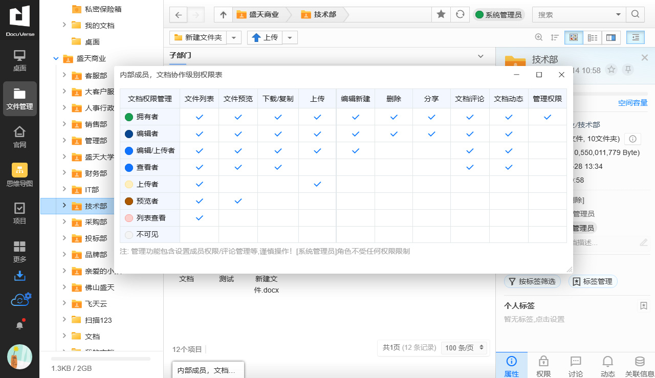 权限管理: 不同部门和级别的员工,文件使用设置不同的权限;